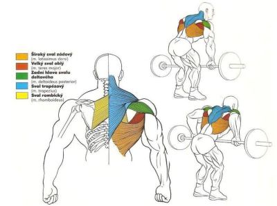 Přítahy jednoručky v předklonu (nebo velké činky v předklonu) - časté chyby kulatá záda, příliš velká váha na úkor techniky, nedostatečné předklonění. Přítahy jednoruček provedeme na lavičce a to způsobem. Opřeme se o lavičku tak, aby tělo bylo rovnoběžně s podlahou, jedna noha na zemi druha na lavičce. Zvedneme činku ze země a zvedáme nahoru (směrujeme k oblasti pasu). Lokty směřuji za záda. Pohled dopředu a rovná záda po celou dobu provádění cviku. Poté činku kontrolovaně pouštíme dolu co nejníže. Pro velkou činku je to obdobné s rozdílem, že cvik provádíme ve stoje.